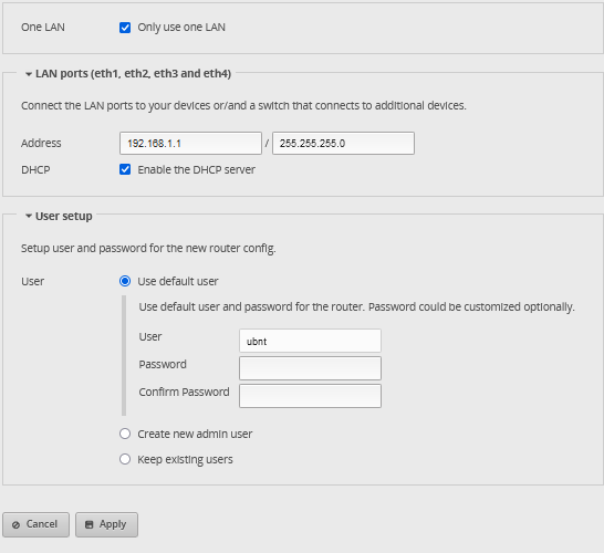 Per impostazione predefinita eth0 viene assegnato un indirizzo IP statico 192.168.1.1. Per configurare l’EdgeRouter, collegare una cavo di rete dal pc a eth0 in impostare un indirizzo ip fisso sul pc (es. 192.168.1.10, subnet 255.255.255.0, gateway 192.168.1.1).