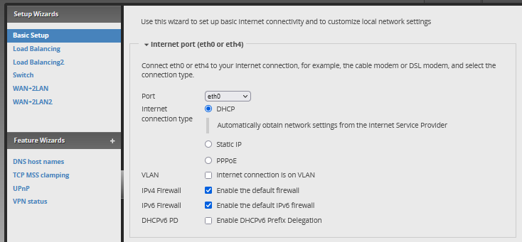 - Basic Setup: installazione classica con una porta WAN e 4 porte dedicate alla LAN o VLan.